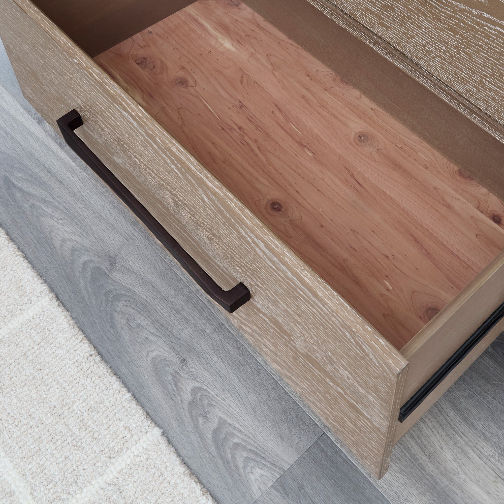 The Breckenridge's chest brings refined style and smart storage to your bedroom. Crafted from hardwood solids with oak veneers, it features a rich Mocha Medium Brown finish that enhances the natural wood grain. The chest’s canted legs and inset drawers create a dynamic, eye-catching profile. Soft-close drawers offer smooth, quiet functionality, with felt lining in the top drawer for delicate items and cedar lining in the bottom drawer to help keep clothing fresh.