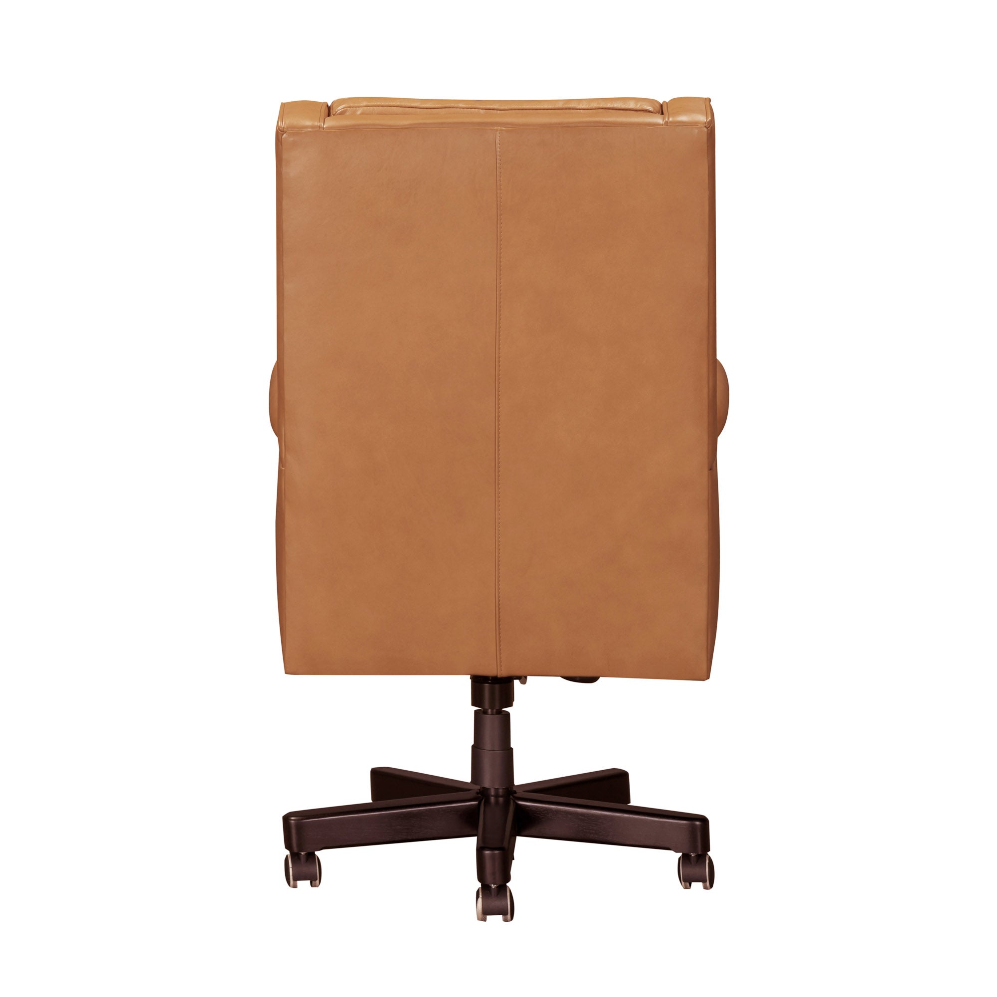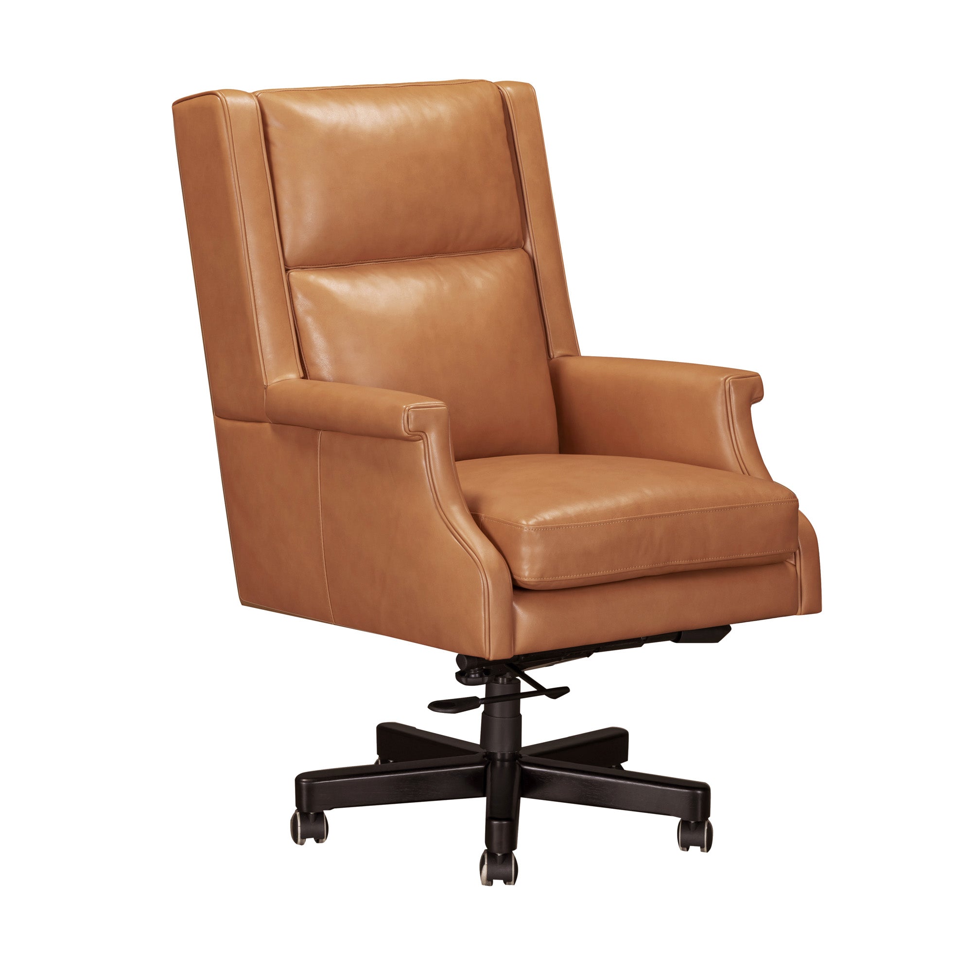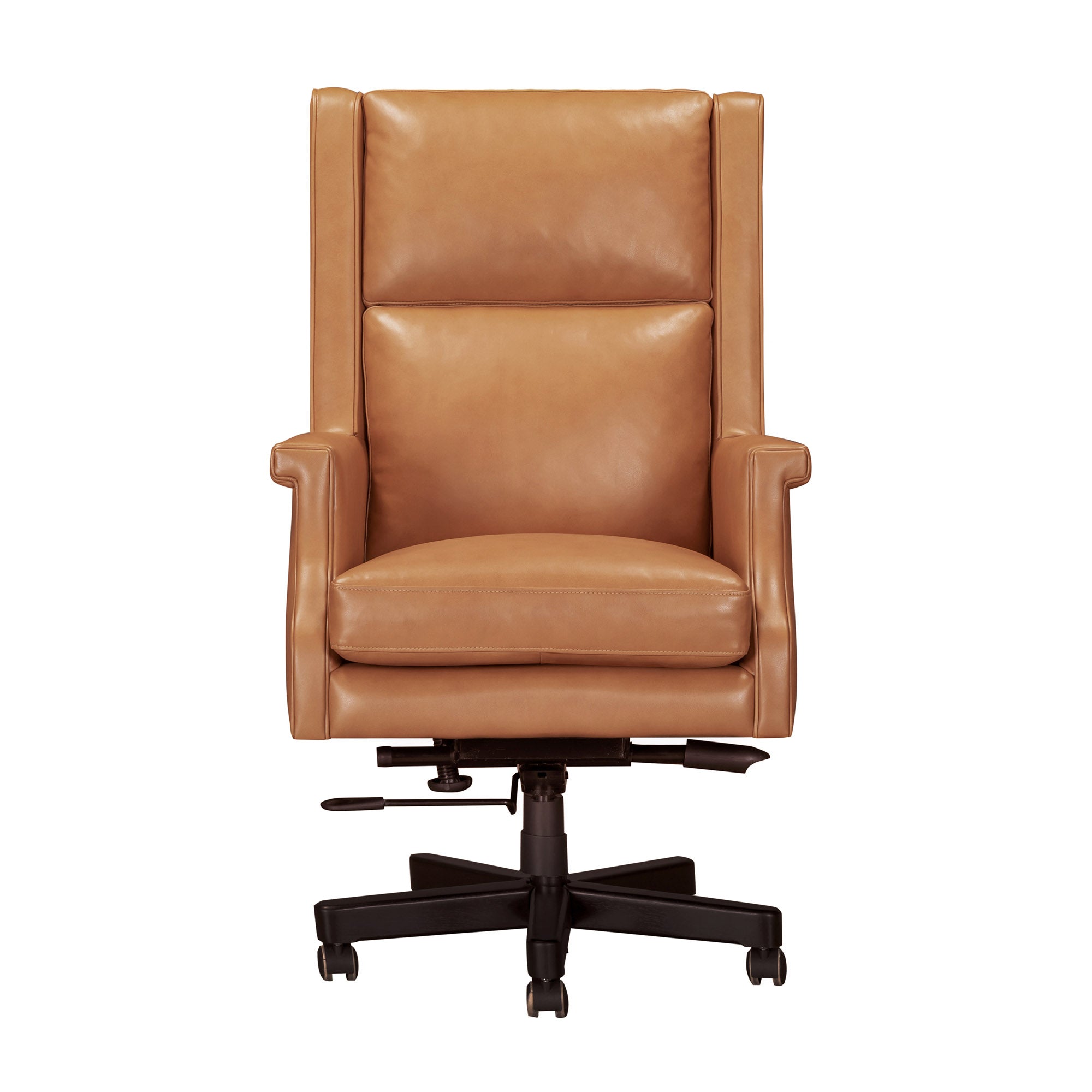 Wrapped in custom-matched top-grain leather, this executive chair strikes a balance between luxury and performance, featuring a 360-degree swivel, smooth tilting recline, and air-lift height adjustment. Designed for all-day comfort with a structured bustle back, padded key arms with self-welting, and a removable 2.2-density foam seat cushion. Set on a matte black wooden base with rolling casters for easy mobility.